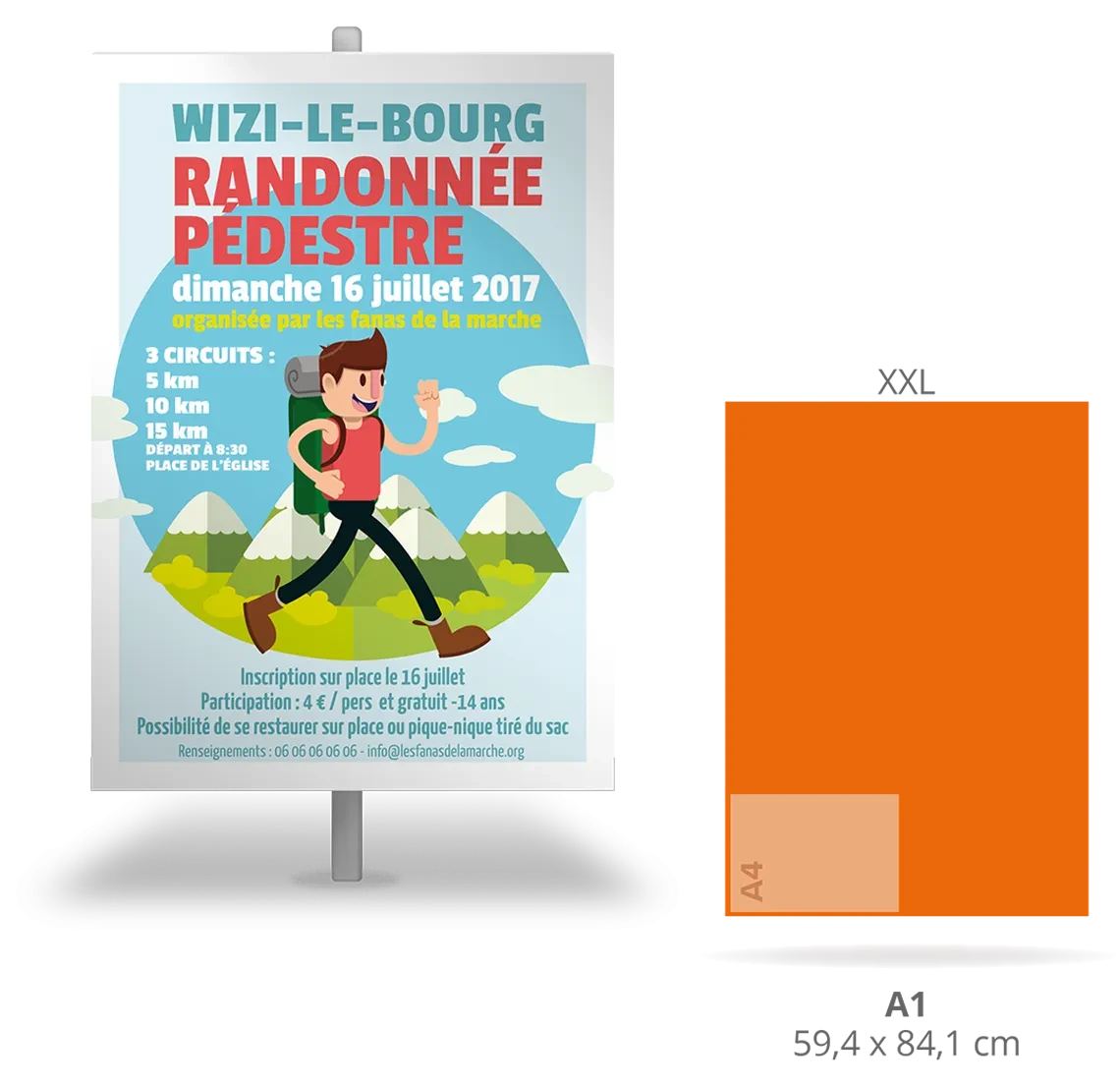 Le très grand format, facilitera un affichage bien lisible sur des lieux de passages rapide comme les bords de routes, les entrées de villages... Le panneau vous permettra aussi de bien marquer l’emplacement lors du jour de votre évènement.